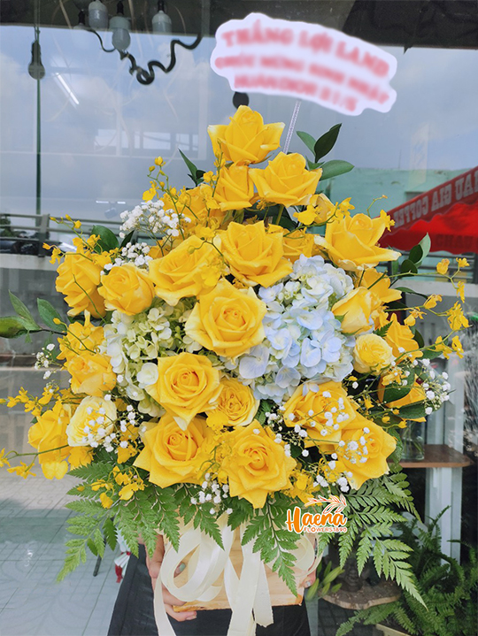 Tặng kèm thiệp chúc mừng, băng rôn, bảng treo theo thông điệp yêu cầu