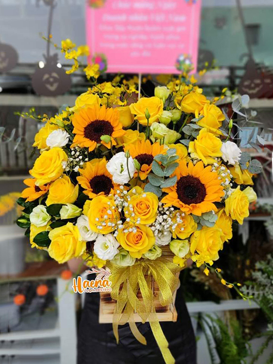 Tặng kèm thiệp chúc mừng, băng rôn, bảng treo theo thông điệp yêu cầu