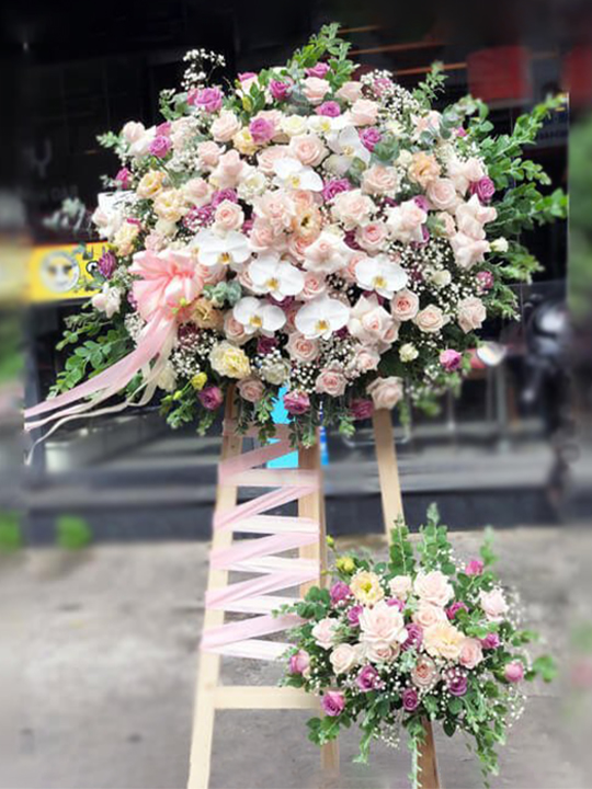 Tặng kèm thiệp chúc mừng, băng rôn, bảng treo theo thông điệp yêu cầu